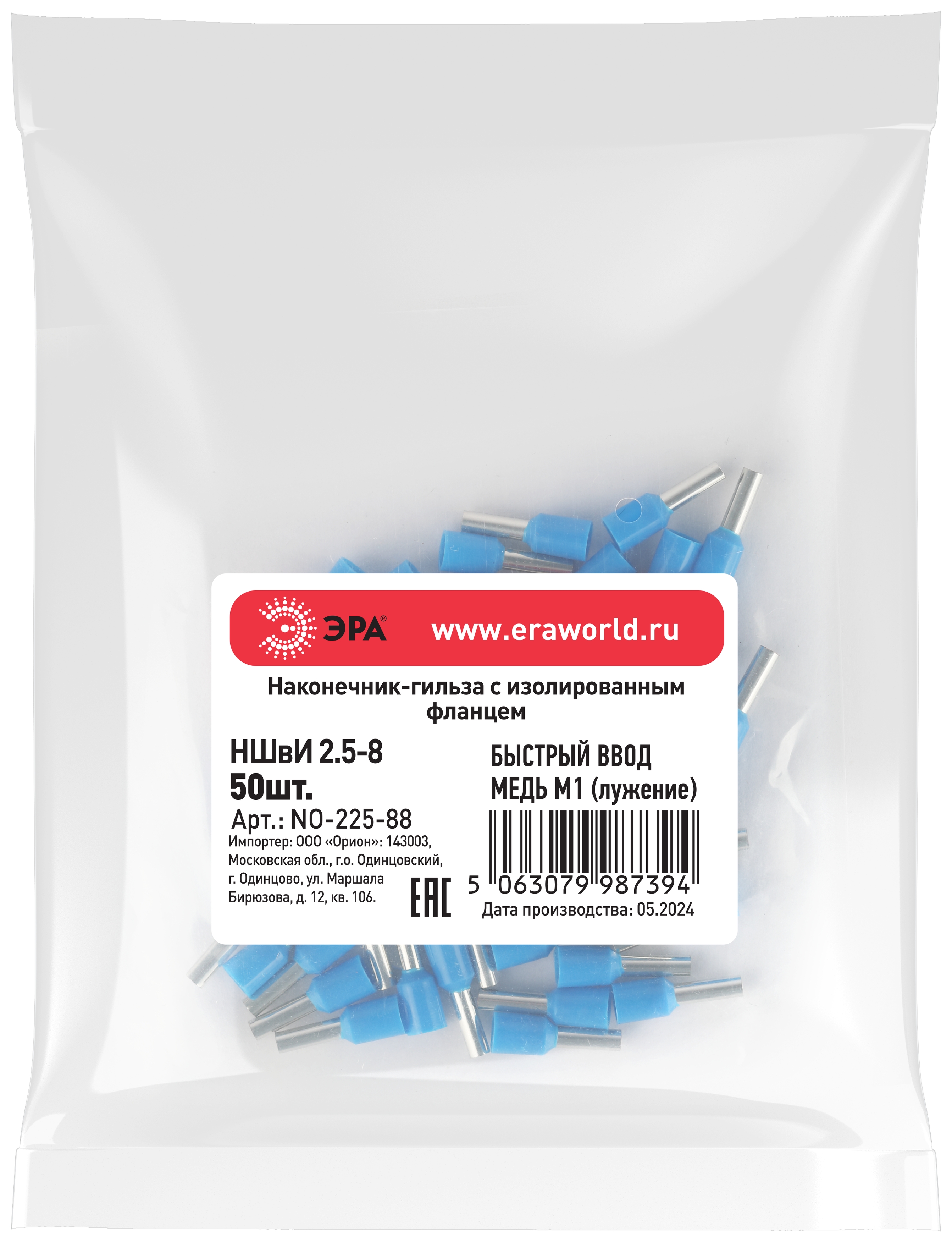 Название производителя: Наконечник-гильза ЭРА NO-225-88 НШвИ 2.5-8 с изолированным фланцем упаковка 50 шт
