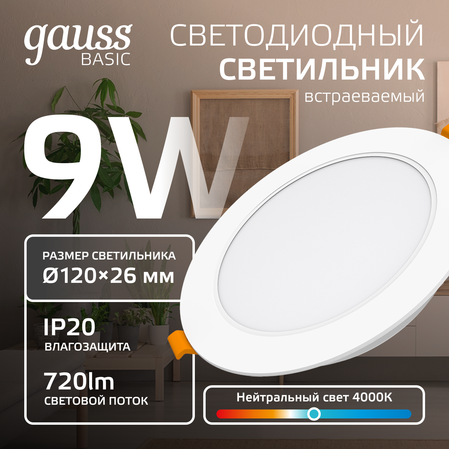 Светильник Gauss Basic Downlight круг 9W 720lm 4000K 170-260V IP20 120*26 белый LED 1/100