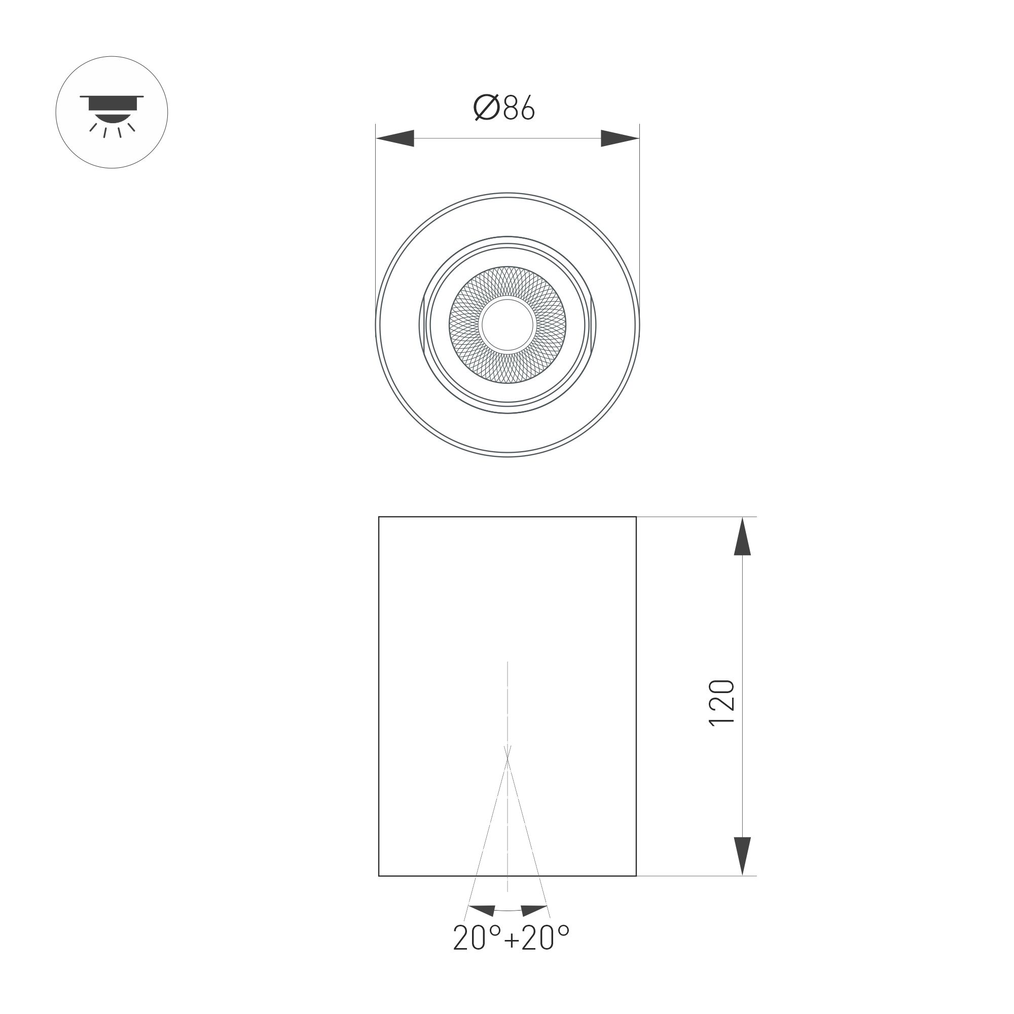 Накладной интерьерный светильник. Мощность 10 Вт, св. поток 970 лм, 93 лм/Вт, теплый 3000 K, CRI>90, угол 50°, регулируемое направление луча 40° (20+20), поворотный световой модуль вокруг своей оси на 340°, UGR <18, напряжение питания 230 В. Белый круглый корпус из алюминия, степень защиты IP54. Размер: диаметр 86,5 мм, высота 120 мм. Монтаж накладной. Драйвер 27-43 В, 250 мА, пульсация <1%.
