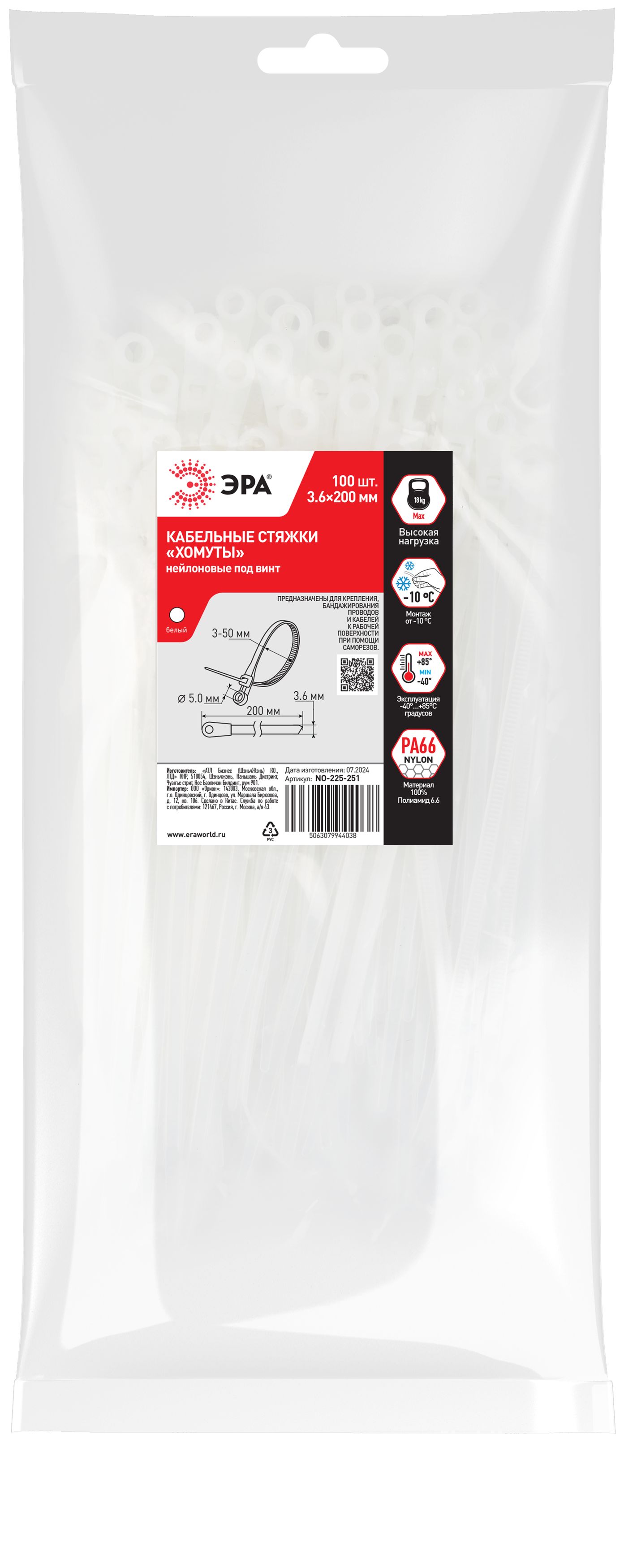 Название производителя: Кабельная стяжка ЭРА NO-225-251 (хомут) нейлоновая под винт 3.6 х 200 мм белая (100 шт/уп)