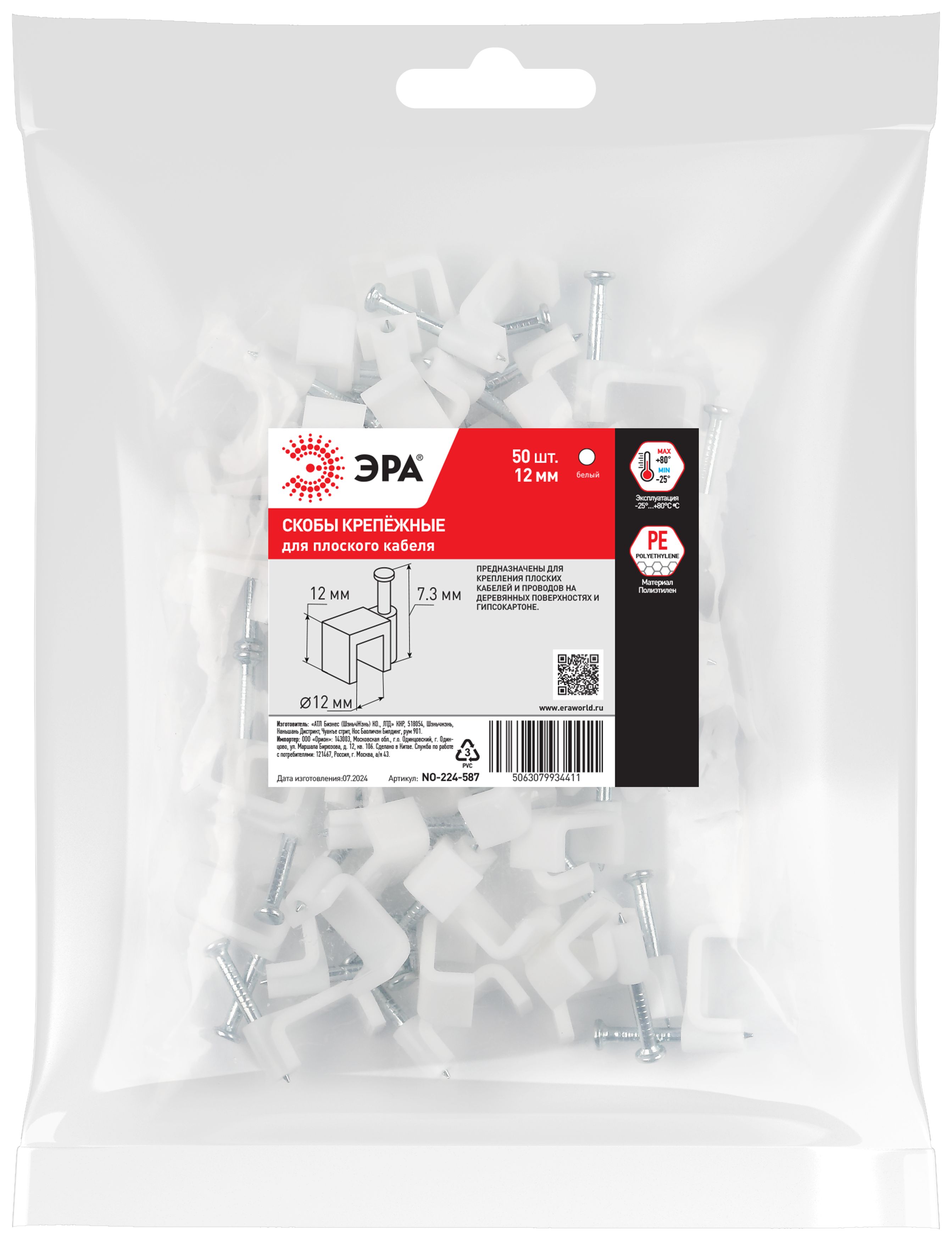 Название производителя: Скоба пластиковая ЭРА NO-224-587 крепежная плоская 12 мм белая (50 шт/уп)