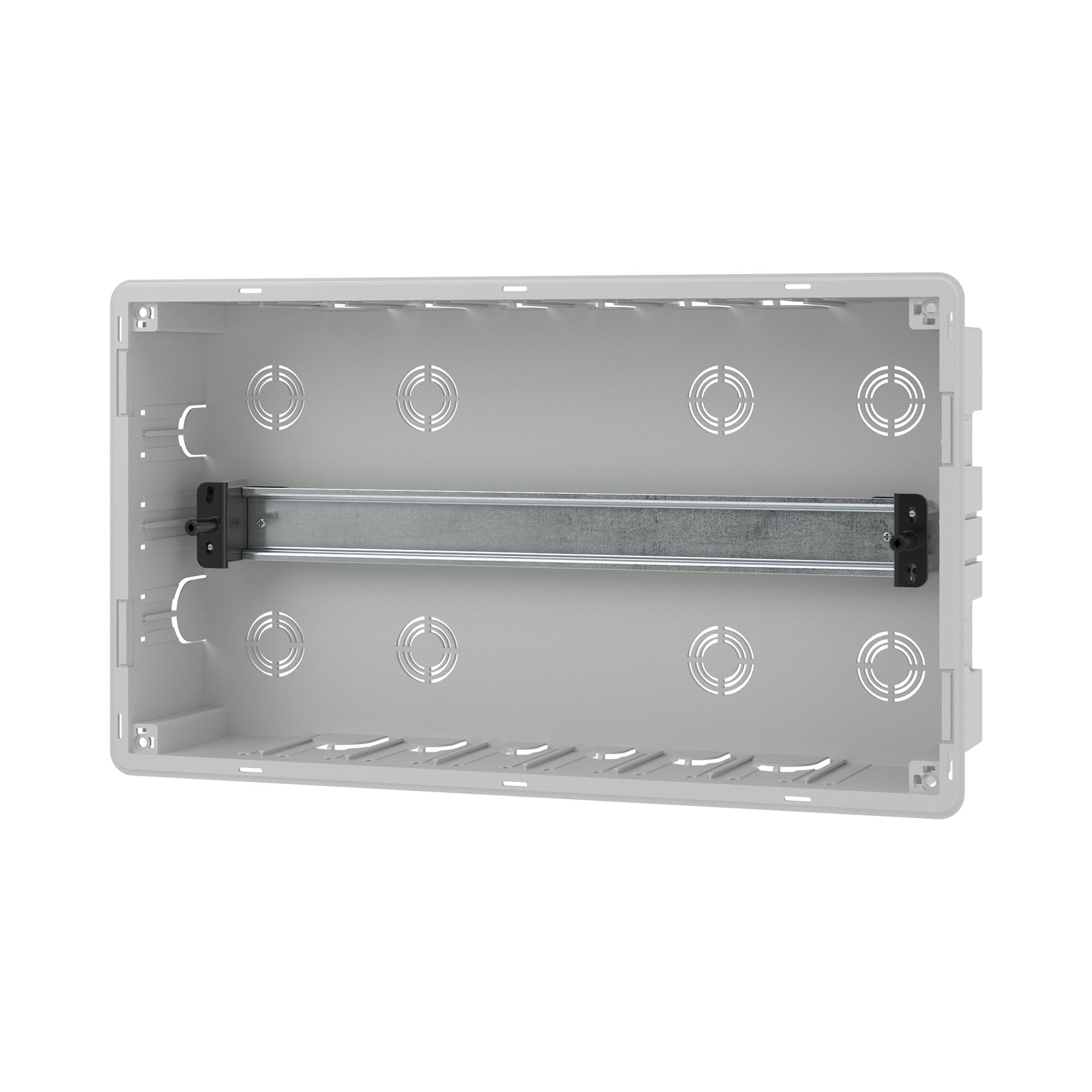 Встраиваемый модульный щиток «Фрейм» (FRAME) предназначен для монтажа скрытым способом в полые стены в жилых и административных помещениях. Применяется для установки модульных устройств. Съёмная рама с DIN-рейками позволяет сначала смонтировать и подключить силовое оборудование и затем установить его в основание щитка в стену. Установка стандартных латунных шин возможна по всем стенкам основания. За счёт симметричного конструктива щитка есть возможность изменения направления открывания дверцы. Количество модулей — 18. Параметры щитка: цвет корпуса белый, цвет двери — прозрачная, ширина — 416,4 мм, высота — 242,4 мм, глубина — 101 мм. Материал — термостойкий и ударопрочный пластик. В комплекте DIN-рейка из гальванической оцинкованной стали, 2 шины PEN на 8 и 10 отверстий, держатели для полых стен