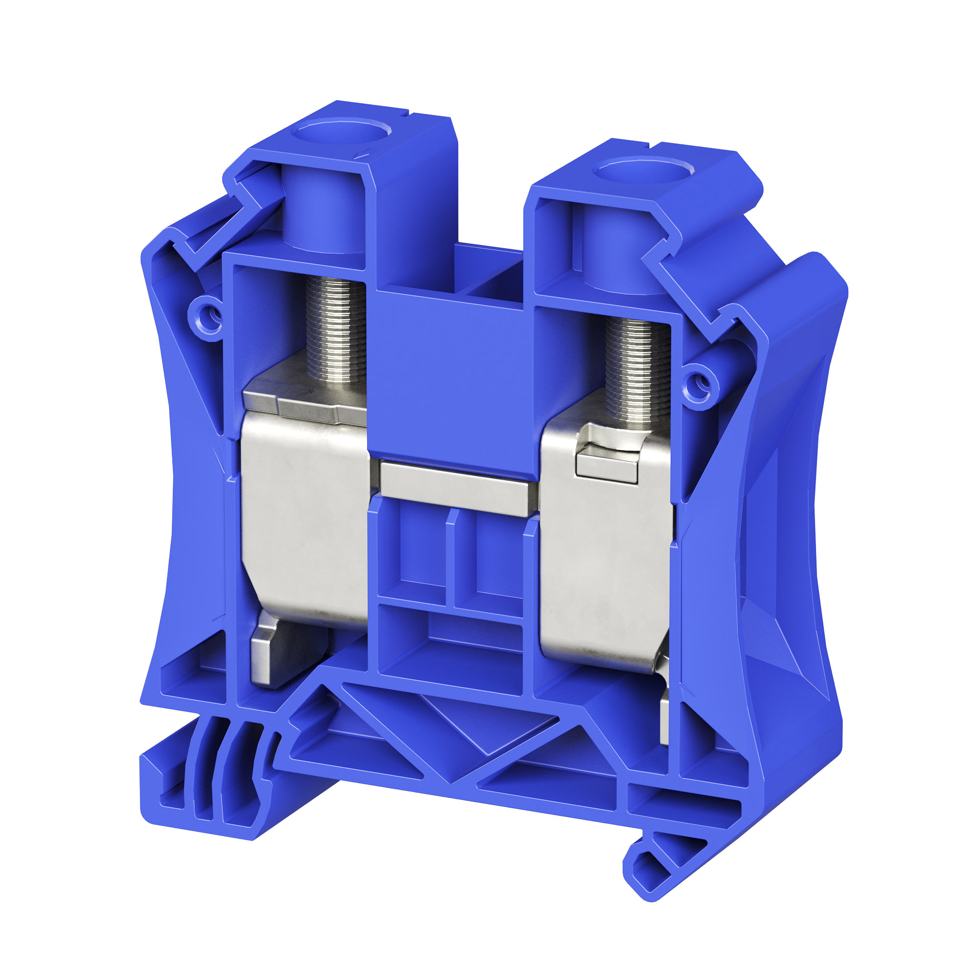 Проходная клемма с винтовым зажимом предназначена для соединения двух проводников. Монтаж на DIN-рейку OMEGA. Температура эксплуатации от -60 до +105°C. Корпус выполнен из ПА 6.6 с классом горючести V0 UL-94. Синий цвет, 2 точки подключения, 35 мм2. 1 канал винтовых перемычек. Габариты (В×Ш×Г) 59,5×56,4×16 мм.
