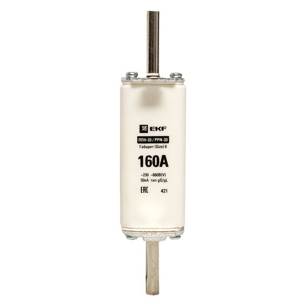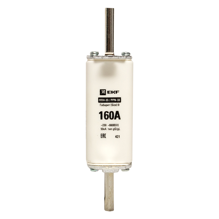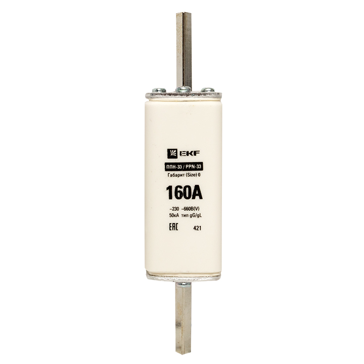 Плавкая вставка ППН-33 160/160А габарит 0 EKF. Предохранители плавкие ППН EKF, укомплектованные плавкими вставками типа gG/gL, предназначаются для защиты кабельных линий и промышленных электроустановок от токов перегрузки и короткого замыкания. Предохранители применяются в электрических сетях переменного тока частотой 50 Гц с напряжением до 660В. Применяются для крепления в распределительных и вводно-распределительных устройствах. Предохранители плавкие ППН могут устанавливаться в основание с держателем, а также в специально предназначенные рубильники. В комплект поставки предохранителей плавких ППН основание с держателем не входит и приобретается отдельно.