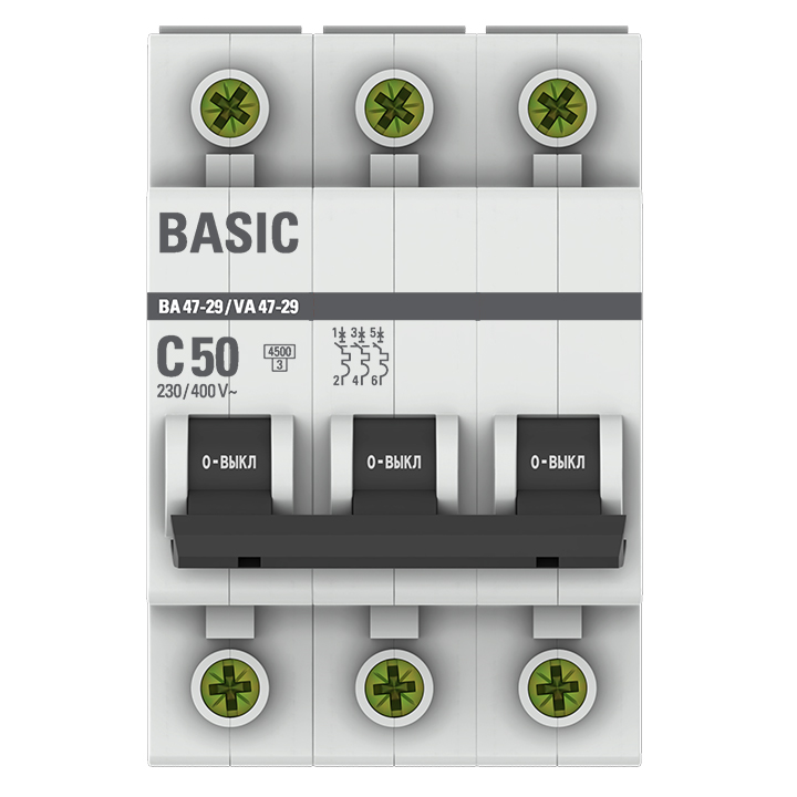 Название производителя: Автоматический выключатель ВА 47-29 3P 50А (C) 4,5кА BASIC